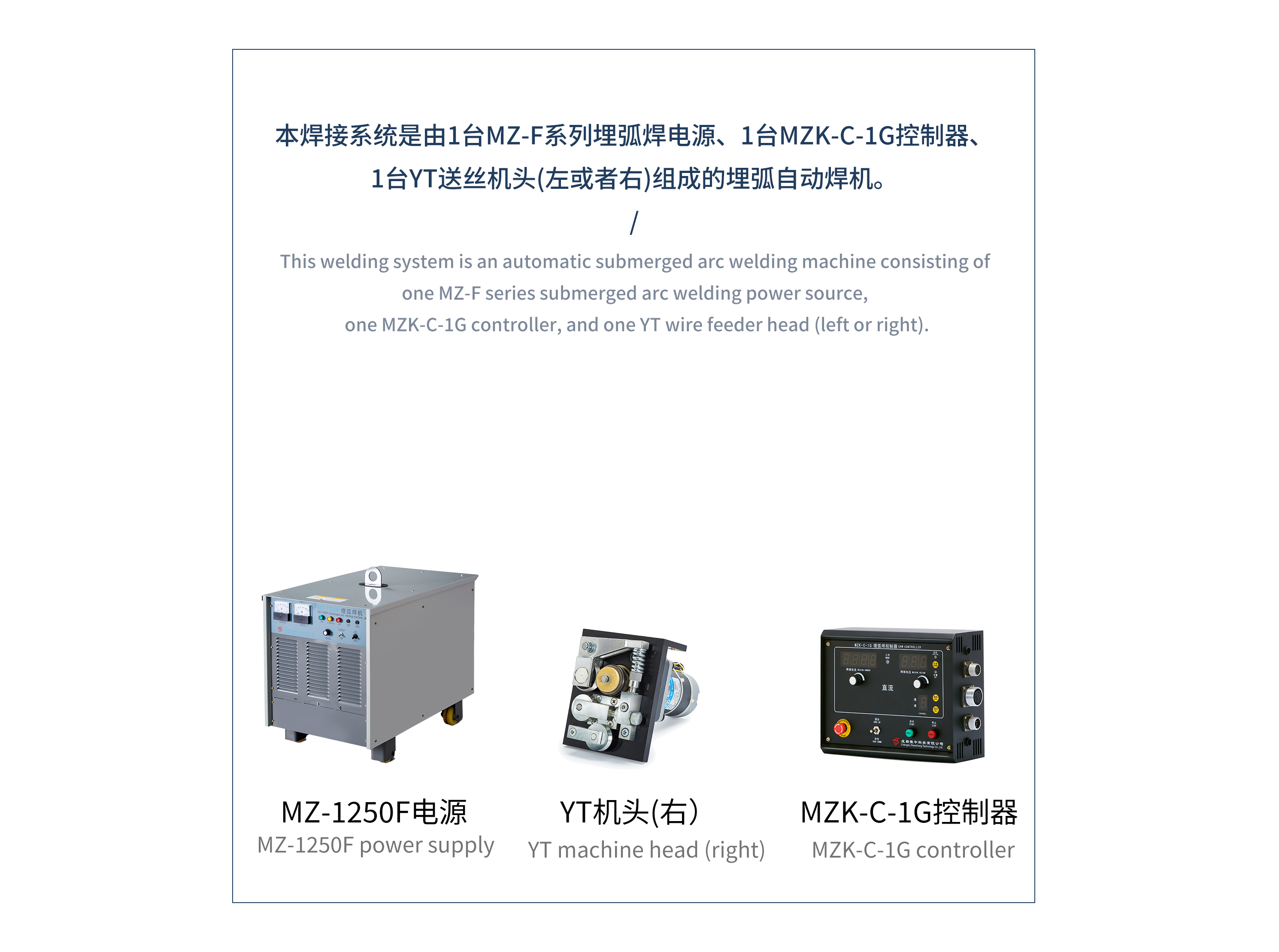 本系统焊机由MZ-F系列埋弧焊电源、YT机头、MZK-C-1G控制器组成的全自动悬挂式埋弧焊接工作站。